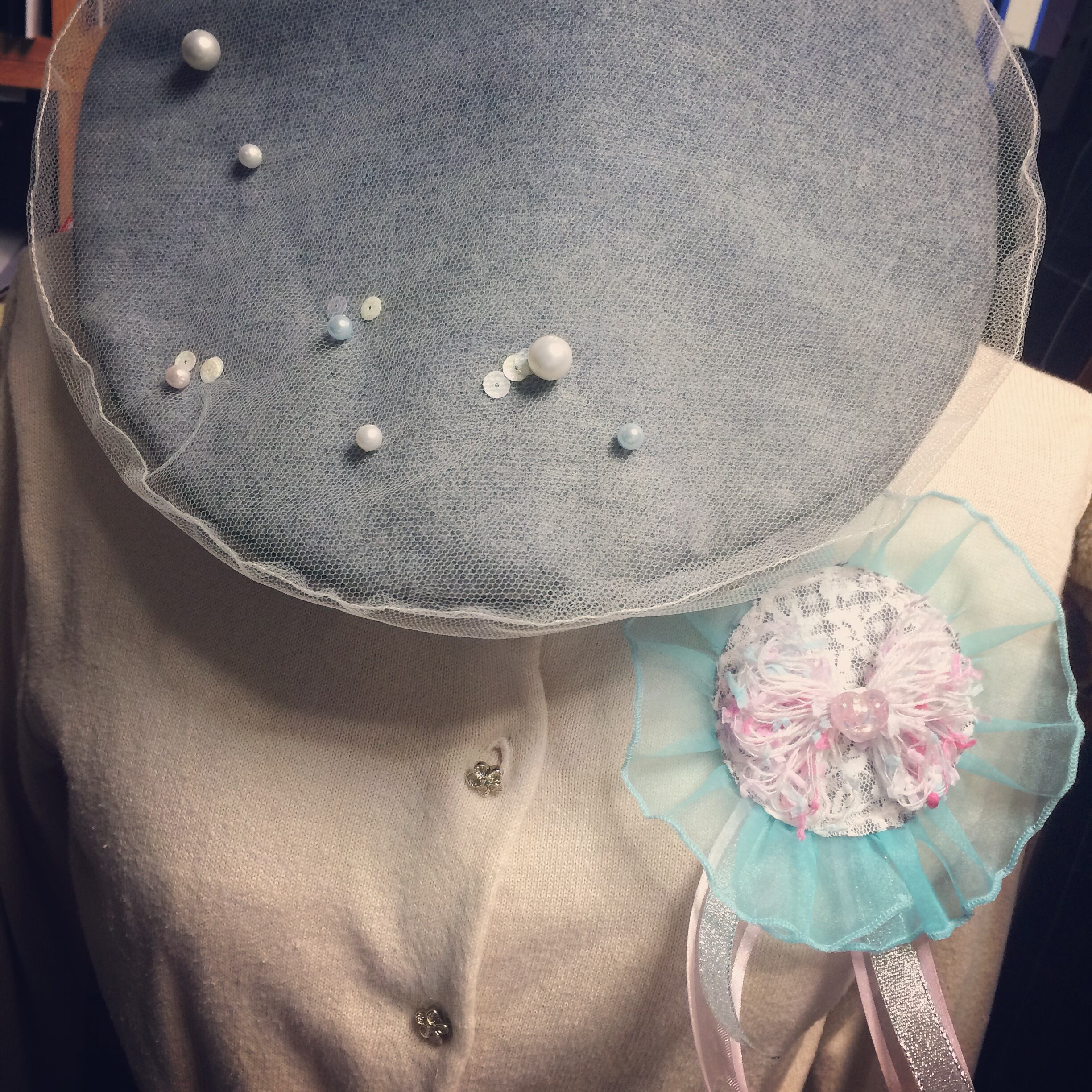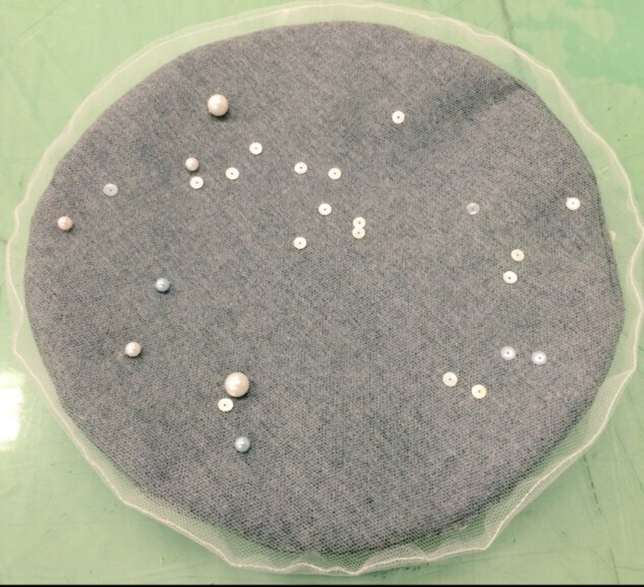 ウール地のベレーの上にチュールをかぶせ、その中にスパンコールを閉じ込めました。