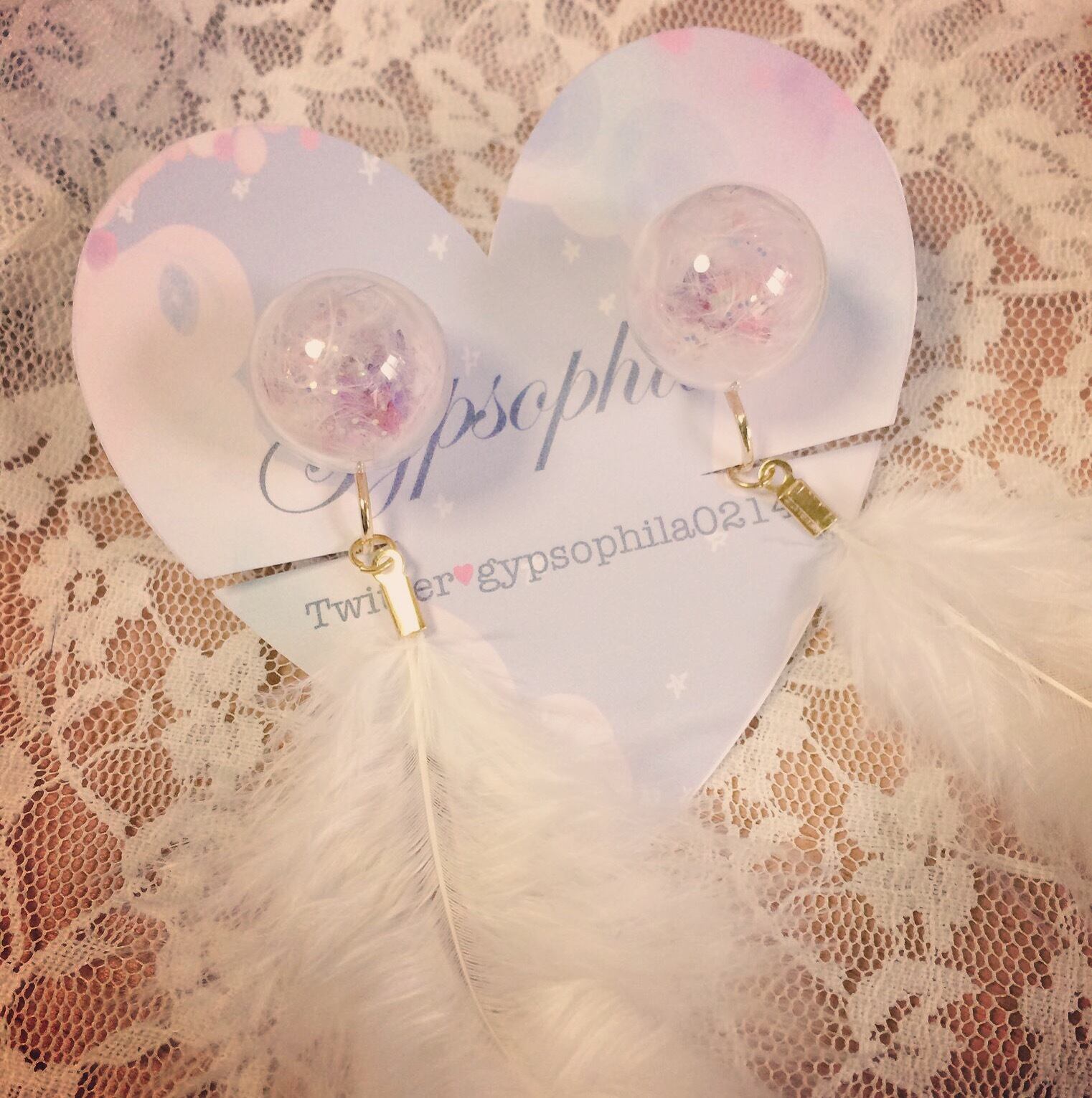 ガラスドームに羽根やホログラム、ビーズ、スパンコールを閉じ込めた乙女なイヤリング♡